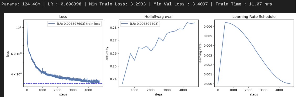 I used a log-uniform sampling strategy to test 39 different learning rates ranging from 10e-4 to 10e-1. Each sampled learning rate was evaluated by training a simplified GPT-2 model (1 transformer layer, 64 channels, 1 attention head) for 1000 steps. After identifying the best learning rates at this smallest scale, I repeated this process for two larger models: one with 2 layers, 128 channels, and 2 heads (Tinier), and one with 3 layers, 192 channels, and 3 heads (Tiny). I recorded the best learning rate for each size, then plotted these points against model parameter count on a log-log scale. A regression line was fitted through the three data points to model the functional relationship between model size and optimal learning rate. This line was used to extrapolate the predicted optimal learning rate for the 124M-parameter GPT-2 Small model.